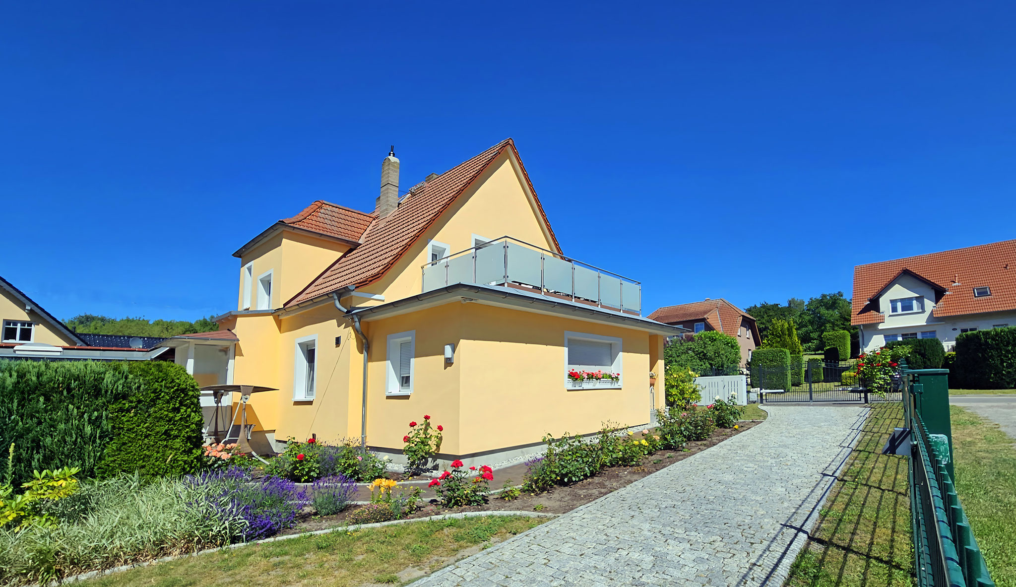 Das Haus "Richard" befindet sich in ruhiger Ortslage im Seebad Ahlbeck und nur wenige Gehminuten vom Zentrum sowie dem Ostseestrand entfernt. Zwei Gebäude befinden sich auf einem etwa 700m² großen, abgeschlossenen Grundstück mit Garten und Grillmöglichkeit. Im Obergeschoss des Wohnhauses bietet die Wohnung 2 auf 50m² Platz für 2-3 Personen. Im Nebenhaus befindet sich im Erdgeschoss die Wohnung 3 für 2-4 Personen mit 2 Schlafzimmern. Bei Anreise mit PKW parken Sie Ihr Auto auf dem abgeschlossenen Grundstück. Ihre Fahrräder können in der Garage abgestellt werden.